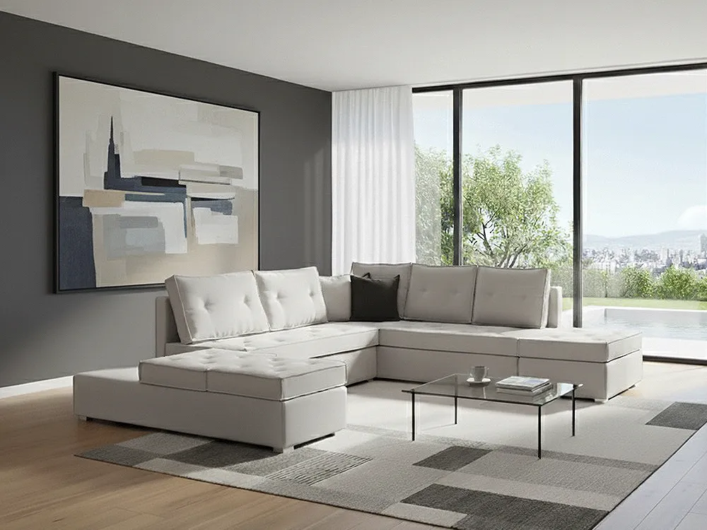 Πολυμορφικός καναπές BELLINA σε σχήμα Π που μπορεί να μετατραπεί πολύ εύκολα σε γωνιακό καναπέ με ανακλύδρο ή σε διθέσιο – τριθέσιο με σκαμπό.